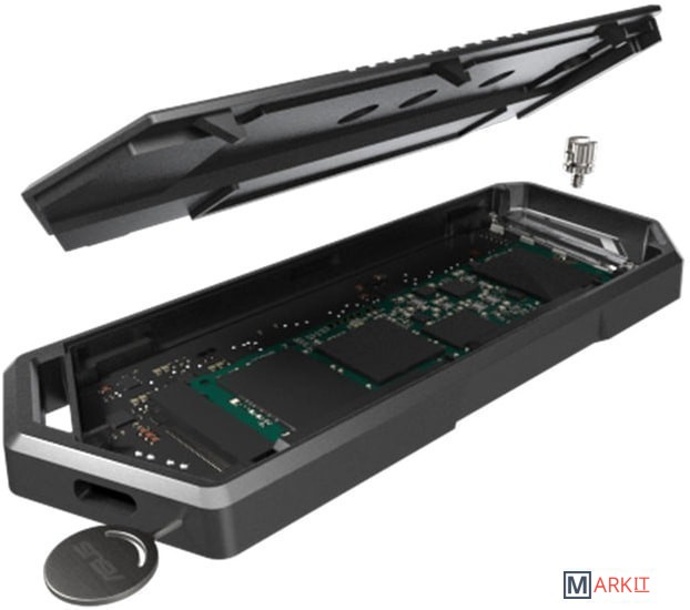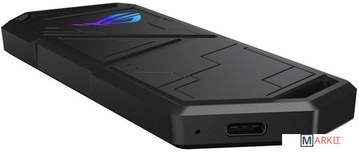 ROG Strix Arion (ESD-S1C) – это контейнер для установки NVMe-накопителей форм-факторов 2230/2242/2260/2280. Он подключается к компьютеру по интерфейсу USB-C 3.2 Gen2 с пропускной способностью до 10 Гбит/с. Алюминиевый корпус с термопрокладками способствует хорошему охлаждению установленного устройства, а встроенная подсветка Aura помогает создать красочную геймерскую атмосферу. К контейнеру прилагается защитный чехол с карабином в виде буквы R.Контейнер ROG Strix Arion (ESD-S1C) изготовлен из алюминиевого сплава. Благодаря термопрокладкам он выступает в роли радиатора, охлаждающего установленный в него твердотельный накопитель, что помогает избежать перегрева и последующего падения производительности.