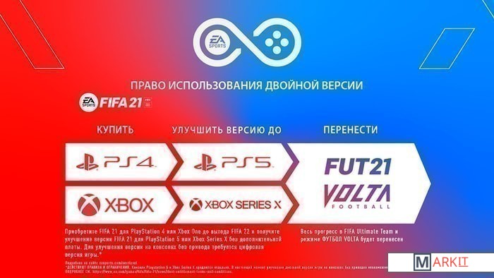 Побеждайте вместе в EA SPORTS FIFA 21 на базе Frostbite. На улицах и на стадионах — FIFA 21 предоставляет еще больше возможностей для игры. Создавайте больше голевых моментов с помощью новой динамической системы атак в самом интеллектуальном игровом процессе FIFA на данный момент. По просьбам сообщества в FIFA были пересмотрены и основы футбола, благодаря чему вырос общий уровень игры — удары головой в ручном режиме, более сбалансированная блокировка, более осмысленные передачи и улучшенный отклик предоставляют больше контроля при игре с мячом и без мячаСоревновательный режим воссоздает стиль игры лучших игроков FIFA в мире. Ваш соперник будет активнее пользоваться особыми приемами, разными типами дриблинга и тактиками, делая матчи на уровнях сложности Легенда и Ultimate сложными и интересными.Благодаря множеству нововведений в матчах, трансферах и тренировках появляется новая глубина — теперь у вас будет больше контроля на пути к футбольным вершинам.Интерактивная симуляция матча открывает новые возможности игры в сезоне. Теперь вы сможете в любой момент вступить в матч и выйти из него, вернувшись к симуляции игры, или брать дело в свои руки в ключевые моменты матча, такие как пенальти или штрафные, чтобы повлиять на результат. Следите за ходом матча и вносите изменения прямо в симуляции, меняя уставших или не показывающих нужной игры футболистов.Приобретите FIFA 21 PS4 до выхода FIFA 22 и улучшите версию до FIFA 21 PS5 без дополнительной платы. На PlayStation 5 и Xbox Series X FIFA 21 будет поставляться в цифровом виде, ее можно будет загрузить после выхода игры. Если вы приобретаете FIFA 21 на физическом носителе, для запуска игры PlayStation 5 или Xbox Series X вам потребуется вставить диск с игрой в привод этих консолей.