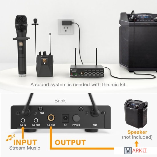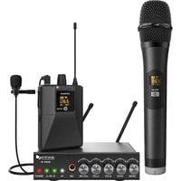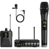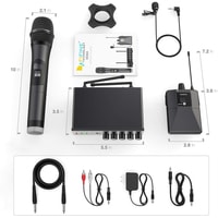 - один радиомикрофон- петличный микрофон- настольный приемник- портативный передатчик- аудиокабель 6.3 мм - 6.3 мм- аудиокабель 3.5 мм - 3.5 мм- аудиокабель 2RCA - 3.5 мм- маркировочное кольцо- адаптер питания- документация |