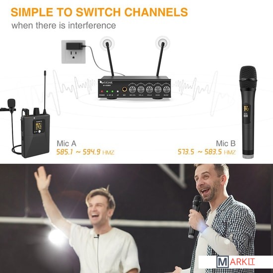 2 (1/4" TRS, 1/8" TRS) (микрофонный вход, линейный вход - на приемнике) |