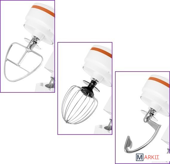 - моторный блок;- чаша миксера;- крышка чаши миксера;- венчик для сбивания;- насадка для смешивания;- крюк;- руководство по эксплуатации. |